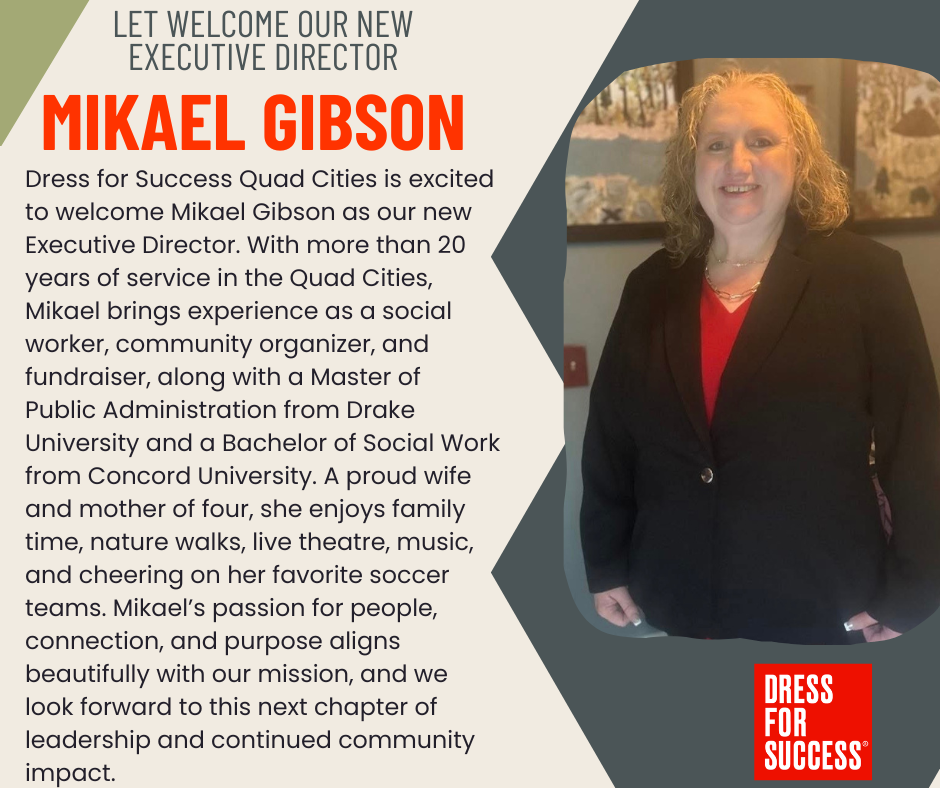Dress for Success Quad Cities is a nonprofit serving women in the greater Quad Cities area by providing job search and career development services as well as professional attire for interviews. Our objective is to create lasting change by equipping women in the Quad Cities area with the resources and ongoing support needed to obtain and retain jobs that bring economic stability to their lives – ultimately building skilled leaders in our community.