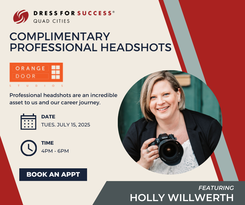 We are incredibly grateful to be able to partner with Holly and Orange Door Studios to offer FREE professional headshots to women throughout the QC community. We hope you’ll take advantage of this amazing opportunity.