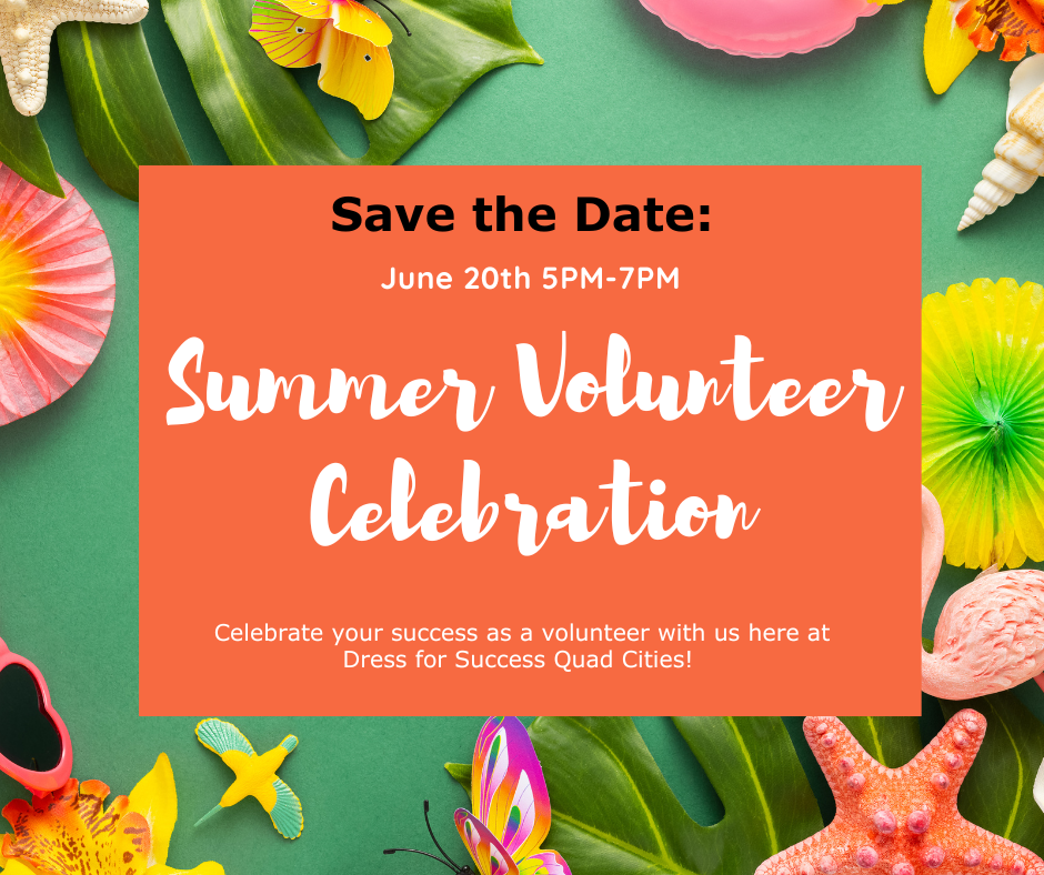 Get ready to soak up the summer vibes at our Volunteer Summer Celebrationโa fun-filled mixer just for you! Join us as we celebrate your incredible contributions with an unforgettable evening at Dress for Success Quad Cities.